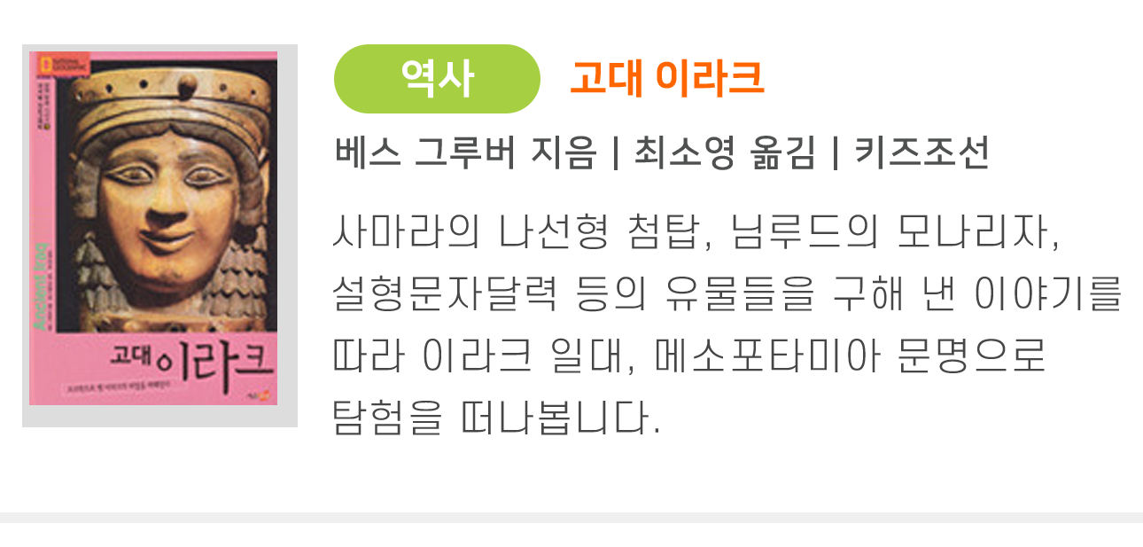 내셔널 지오그래픽 문명 탐험 시리즈 4권, 고대 이라크. 고고학으로 옛 이라크의 비밀을 파헤친다. '키즈조선'은 조선일보생활미디어(주)의 유아, 어린이용 전문 브랜드입니다.