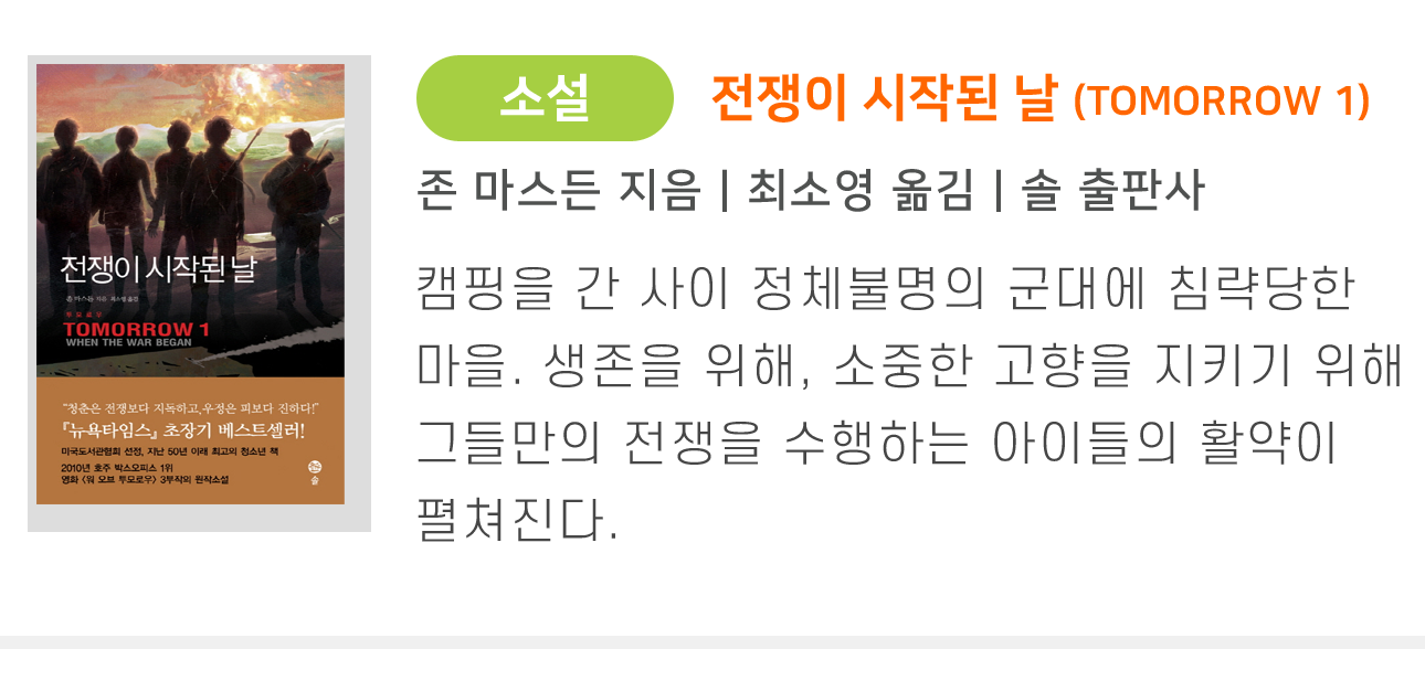 영화 <워 오브 투모로우> 3부작의 원작소설인 이 소설은 미국도서관협회가 선정한 '지난 50년 이래 최고의 청소년 책'으로 꼽히기도 했다. 17세 소녀 엘리의 1인칭 시점으로 이야기를 그려나가며, 전쟁에서 일어날 수 있는 모든 일들에 대한 고민을 담아낸다. 아이들은 생사를 넘나드는 속에서 그동안 몰랐던 다양한 면을 발견하고, 서로 사랑에 빠져들기도 한다. 어른과 아이의 경계, 자연과 문명의 경계, 삶과 죽음의 경계 위에서 고군분투하는 십대들의 모습이 전쟁과 인간의 의미를 다시 생각해보게 한다.