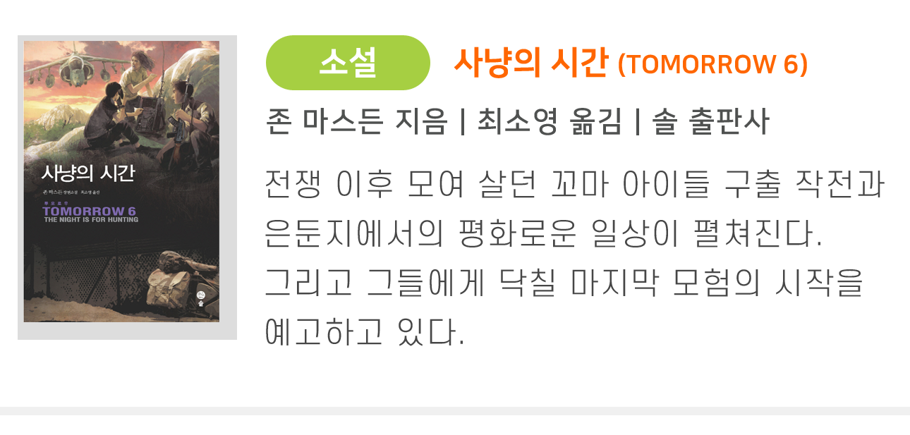호주의 국민작가 존 마스든이 10년에 걸쳐 완성한 베스트셀러 「Tomorrow」 시리즈. 7권으로 구성된 이 장편소설은 가상의 전쟁을 배경으로 게릴라 활동을 벌이는 십대들의 이야기를 그리고 있다. 캠핑을 간 사이 정체불명의 군대에 침략당한 마을. 어른들이 주도하던 문명사회와 완전히 단절된 채 살아남기 위해, 고향을 지키기 위해 그들만의 전쟁을 수행해나가는 아이들의 활약이 펼쳐진다. 스스로 움직여 자신들이 할 수 있는 일을 해내면서 조금씩 성장하는 소년소녀들의 심리를 생생하게 묘사하고 있다. 제6권 『사냥의 시간』에서는 전쟁 이후 모여 살고 있던 꼬마 아이들 구출 작전과 은둔지 헬에서의 평화로운 일상이 펼쳐진다. 그리고 그들에게 닥칠 마지막 모험의 시작을 예고하고 있다.