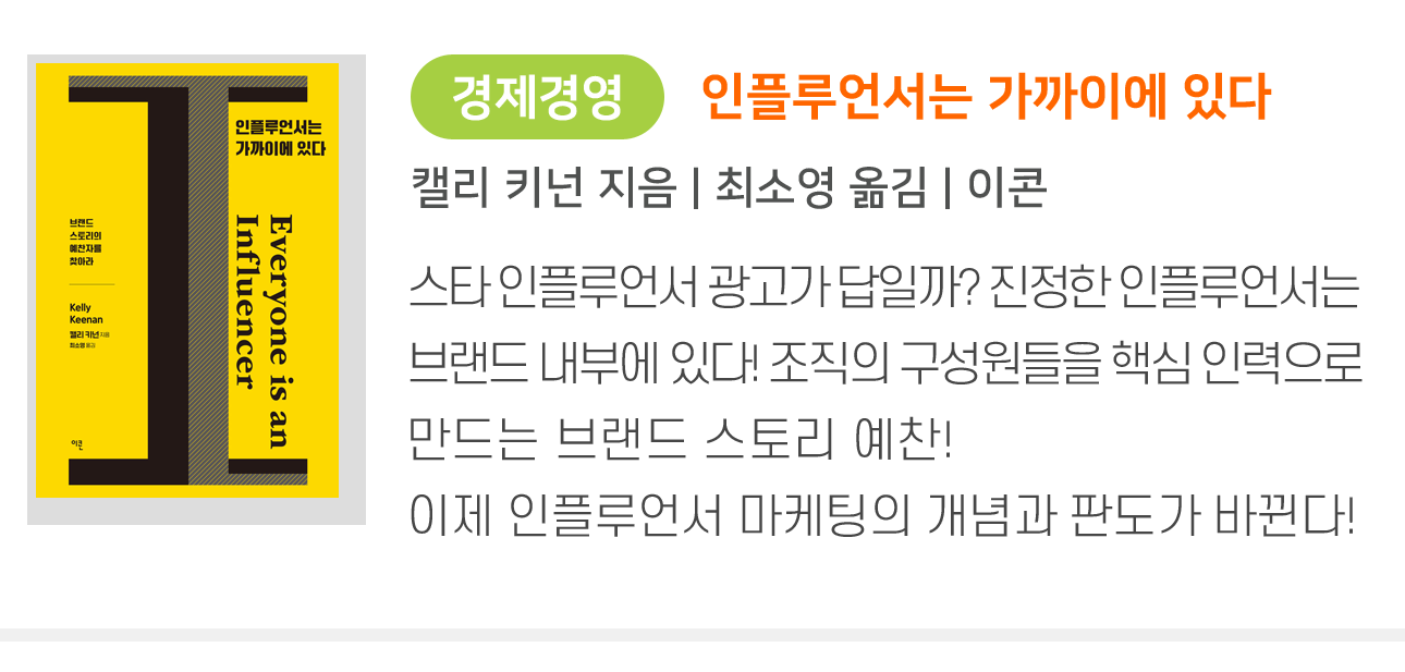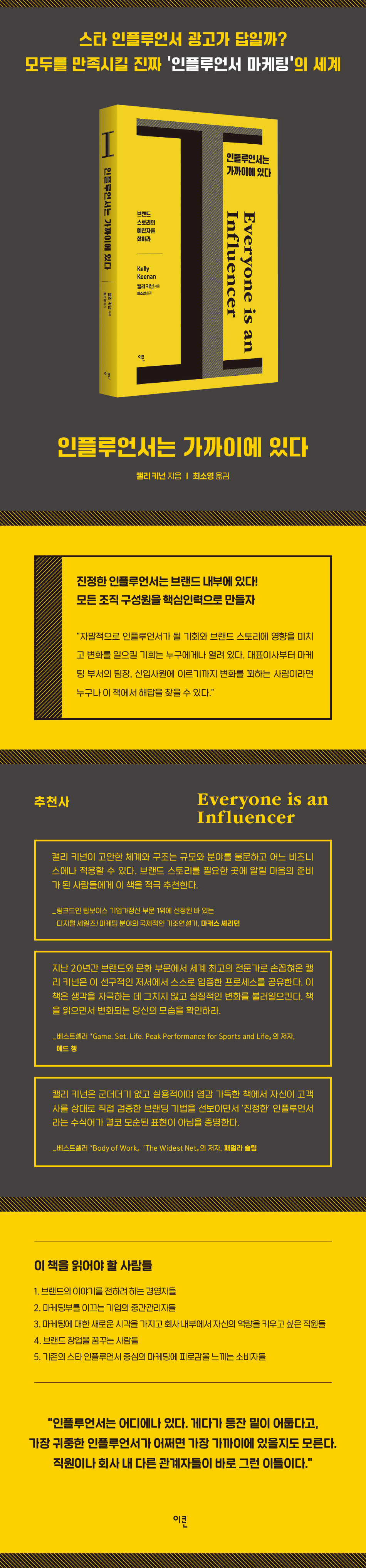 기업은 모든 조직 구성원이 인플루언서로 거듭날 수 있는 분위기를 조성해야 한다. 무엇보다 조직의 리더가 앞장서야 한다. 어느 누구에게도 특정한 메신저 역할을 강요하기보다 적극적으로 스토리 예찬에 참여할 수 있도록 동기부여를 해야 한다. 사람들이 파티에 참여하는 목적은 활력 충전에서 지적 호기심 충족에 이르기까지 다양하다. 여러 관점과 통찰력, 아이디어가 공유될 수 있도록 하자. 『인플루언서는 가까이에 있다』는 진심을 파는 시대에 모든 브랜드가 품고 있는 자신만의 이야기를 끄집어낼 수 있도록 도와주는 현명한 지침서이다. 기업, 직원 그리고 소비자를 하나로 묶어줄 인플루언서 마케팅을 지금 시작하자.