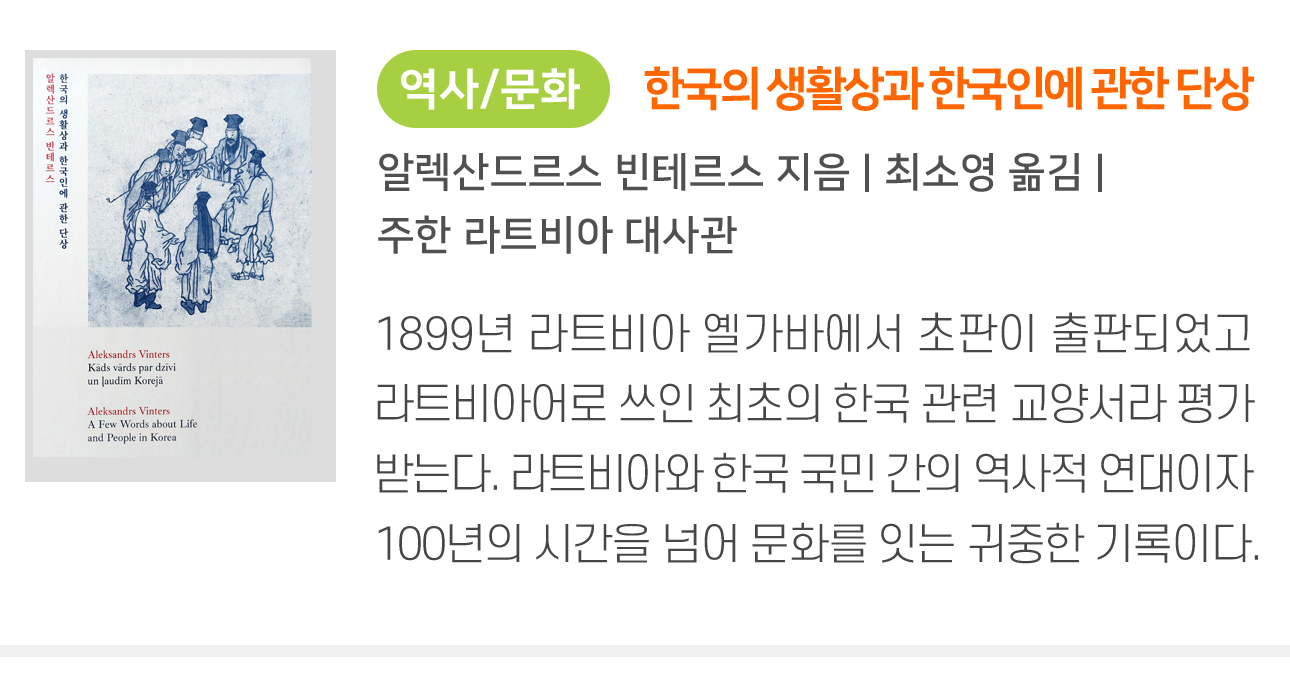 2025년 10월 30일, 서울에서 주한라트비아대사관은 알렉산드르스 빈테르스의 저서 “한국의 생활상과 한국인에 관한 단상”의 재출간을 기념하는 행사를 개최했습니다. 이 책은 1899년 라트비아 옐가바에서 초판으로 출판되었으며, 라트비아어로 쓰인 최초의 한국 관련 교양서로 평가받습니다.